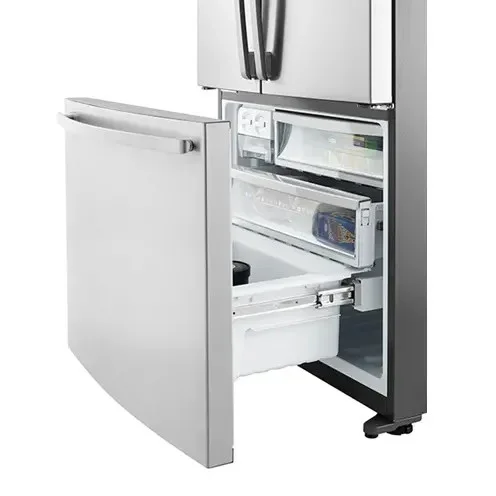 605l stainless steel french door fridge designed to fit inside a 90cm kitchen cavity with water dispenser and automatic ice maker.